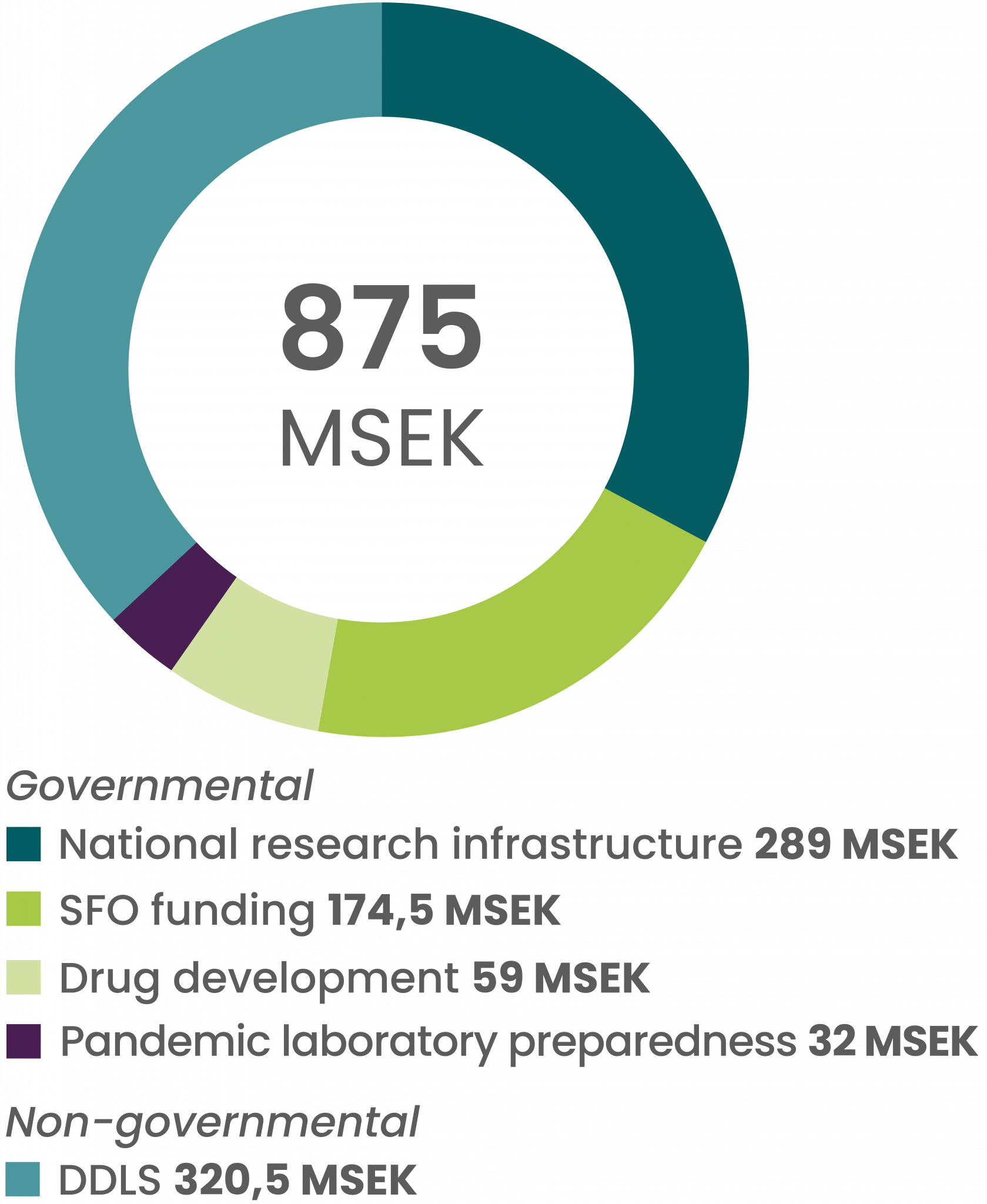 The four-year SciLifeLab budget from the government increased for the current budget period 2021–2024. In addition to increased base funding to the infrastructure of 150 MSEK for 2021–2024, SciLifeLab obtained funding from the government for Pandemic Laboratory Preparedness (130 MSEK). Thus, the total national infrastructure funding, including the DDD, was 309 MSEK for 2021, and gradually increased to 344 MSEK in 2024. The SFO funding has been about 165 MSEK/year (distributed across the four universities).